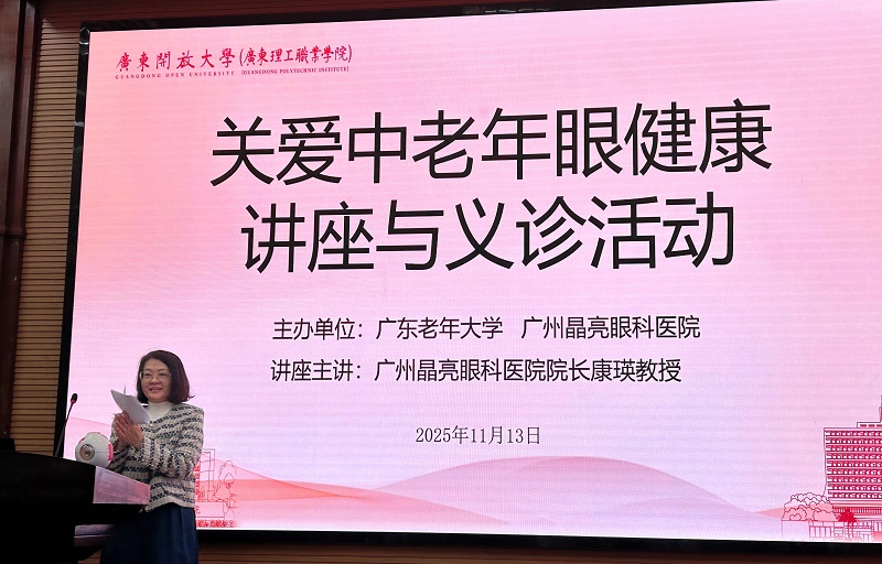 为积极响应“健康中国”行动号召,切实关注师生眼健康问题,11月13日下午,广东老年大学与广州晶亮眼科医院联合举办“关爱中老年眼健康讲座及义诊活动”。讲座特邀广州晶亮眼科医院院长、原中山大学中山眼科中心副主任医师康瑛担任主讲,采用“线上+线下”融合模式同步进行,共吸引200余名老年学员与学校师生参与。讲座由老年大学办公室主任宋菲主持。